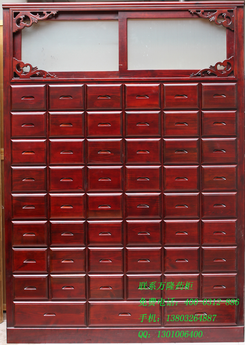 中药柜整体直接创平磨光,直接喷聚脂漆八遍,保持中药柜材质的原木纹路,不打腻子,不贴木纹纸,漆面光滑均匀,颜色光亮,原木纹清晰透明。中药柜仿红木颜色,古朴典雅框架结构榫铆连接合理,承重力强。中药斗采用防鼠设计,底层封钉雪花铁板。拉手用铜环,美观耐用。